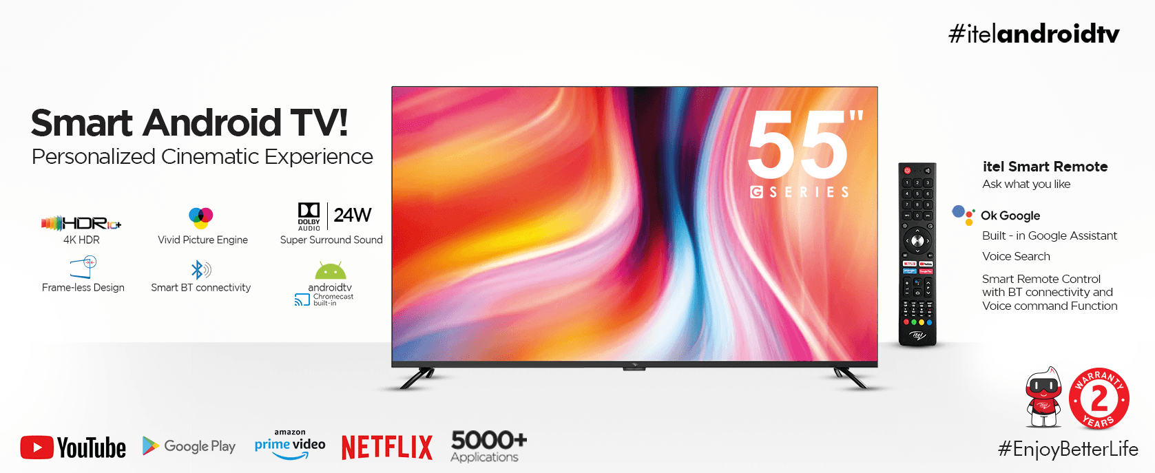 itel G551 Smart 55″ inch UHD Android smart tv personalized cinematic experienceitel G551 Smart 55″ vivid picture engine, this tv have 24Watt (2x12W) Dolby Audio Processing Supported External Audio System, the actual Screen Size 55 inches, display type UHD and also Screen Type UHD itel G551 Smart 55″ tv have an operating systems Android TV 9.0, this tv has 1.5 GB Ram and 8 Gb Rom, Itel G321 Smart 32 Built-in Application Google store, YouTube, Netflix, and more. this tv has itel smart remote.