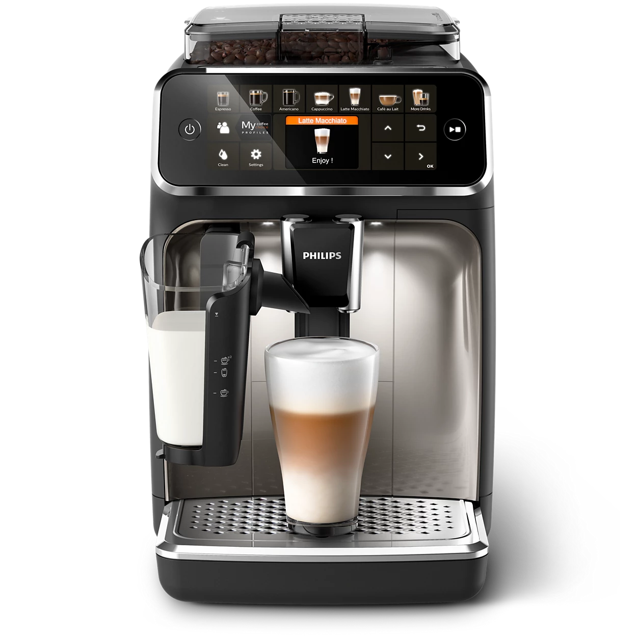 Brew premium coffee at home with the Philips espresso machine 5400 EP5447/90. With 12 fresh bean beverages and the fastest-to-clean LatteGo milk system, it brings a new level of convenience and luxury into your kitchen.
