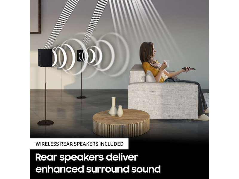 Take your home cinema experience to the next level with wireless rear speakers included in the box. With 2 up-firing and 4 side-firing speakers, immerse yourself in a true cinematic sound experience from the comfort of your home. Say goodbye to trailing cables and enjoy the flexibility of wireless connectivity.
